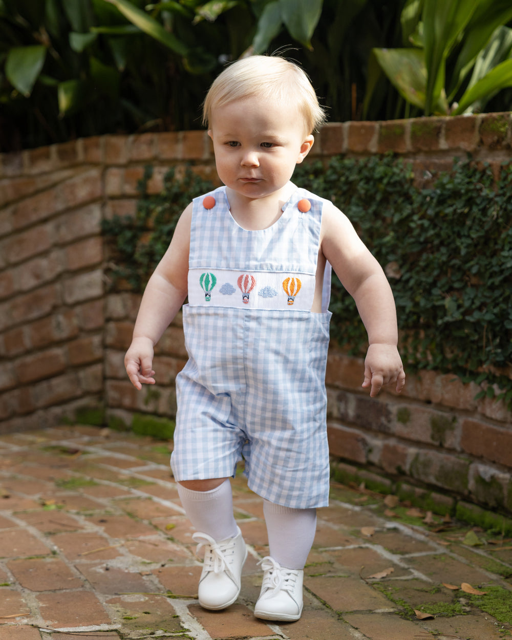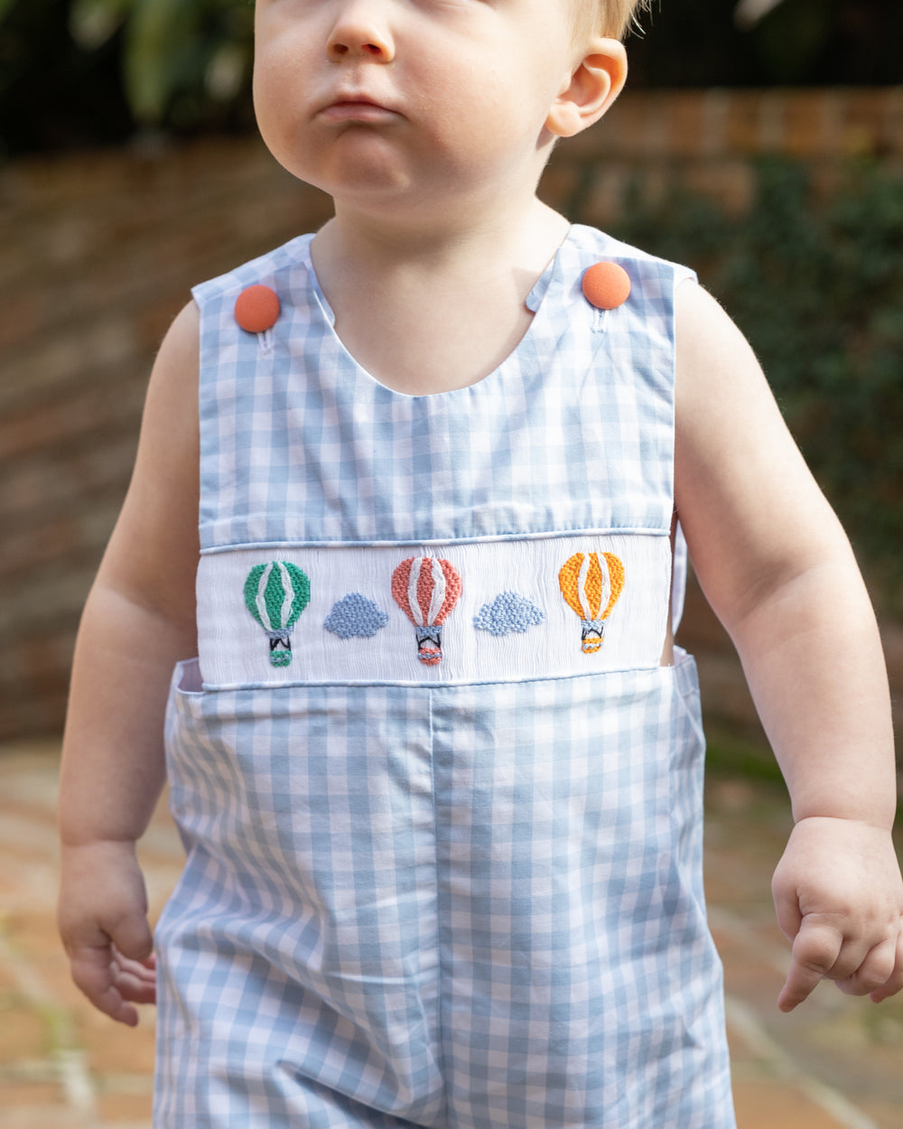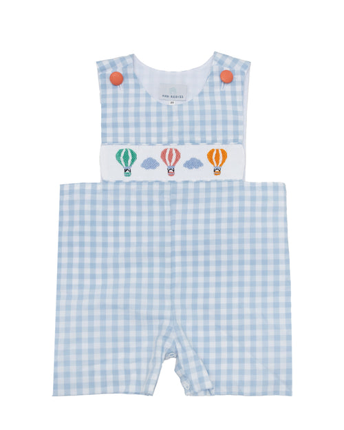 This charming boy's jon jon features a whimsical design with smocked hot air balloons that bring a touch of adventure to any little one's wardrobe.